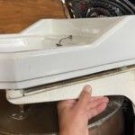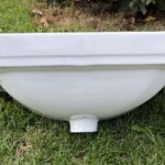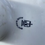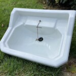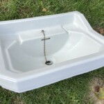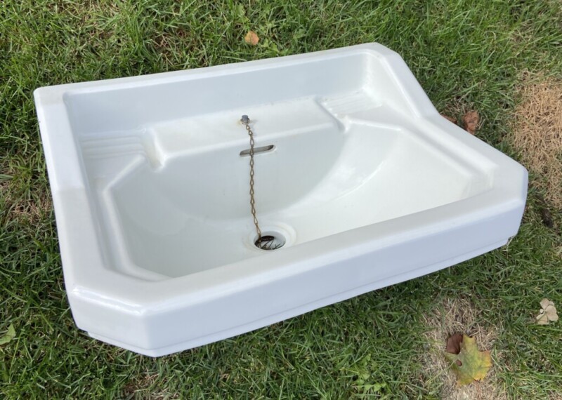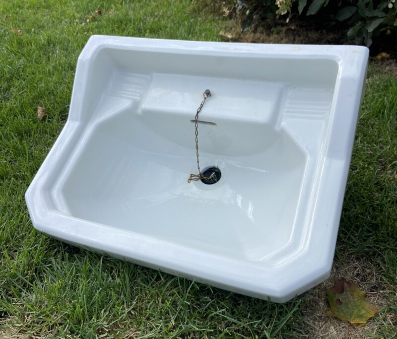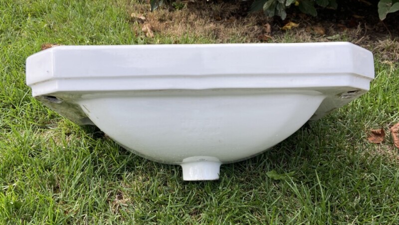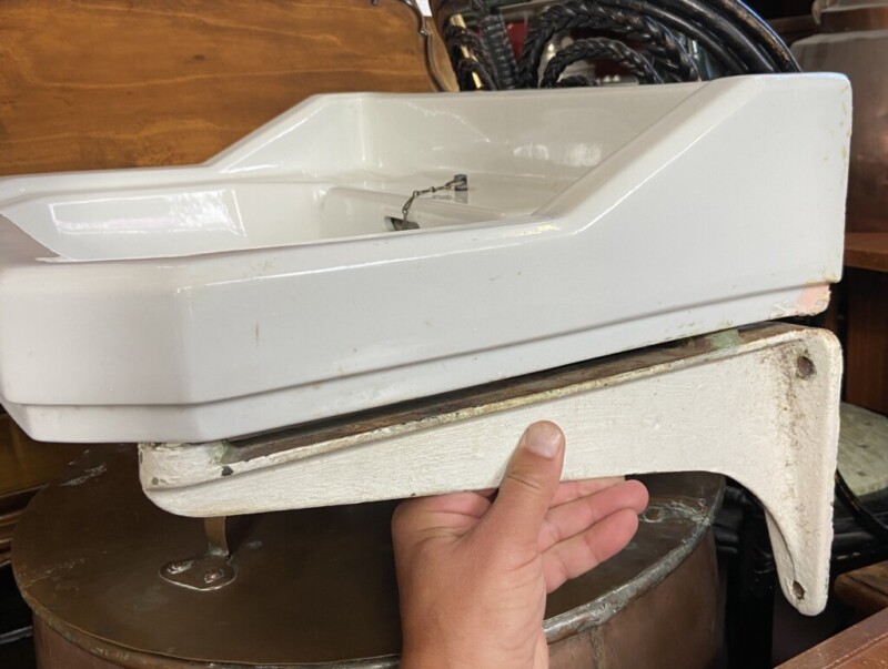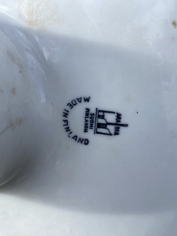 Posliininen pesuallas Arabia, piippuleima, valurautaiset alkuperäiset seinäkiinnikkeet 2 kpl Mitat: 56x42