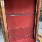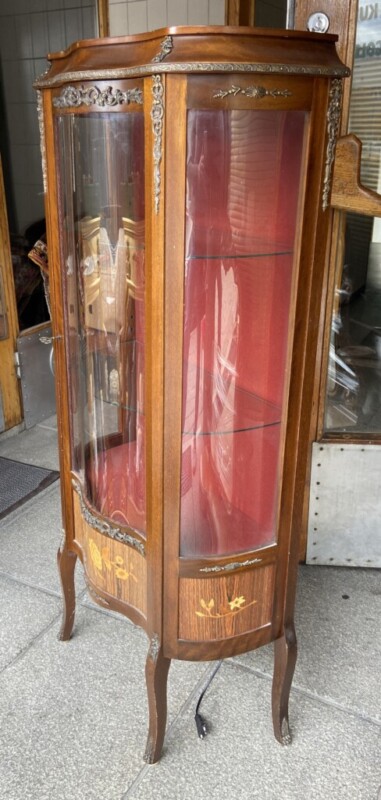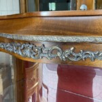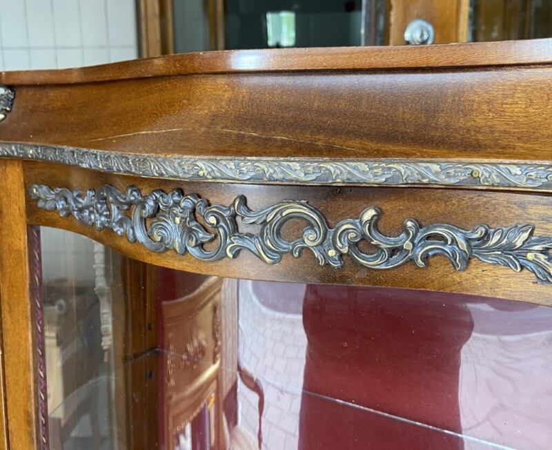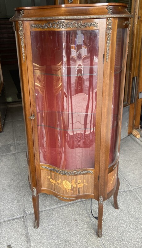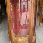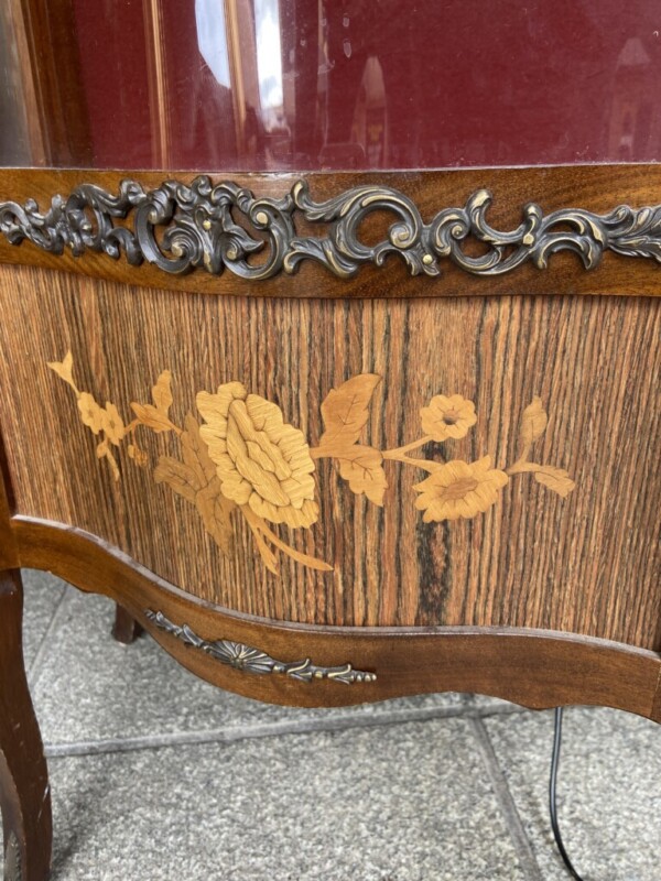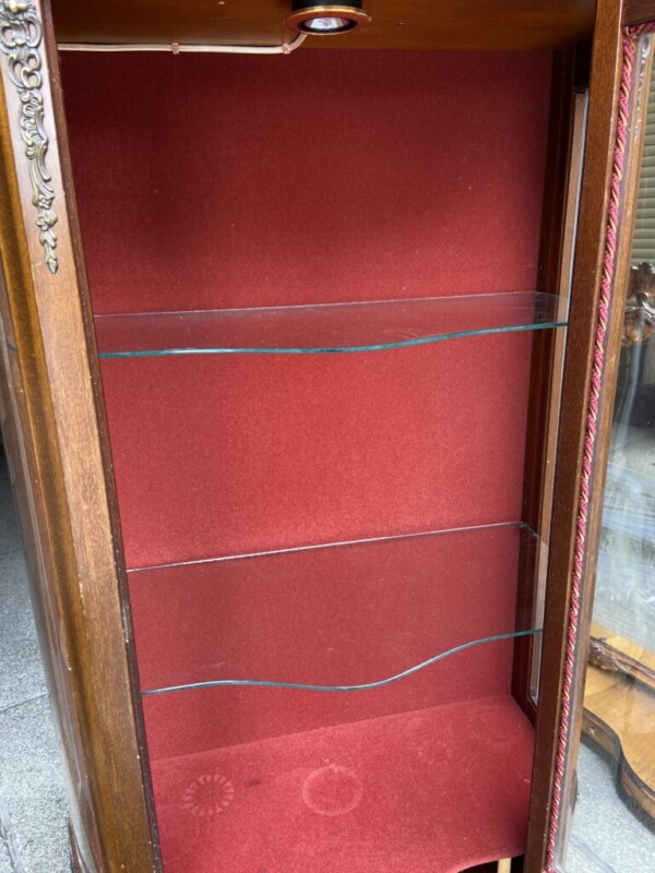 Rokokoo kulmavitriinikaappi, pähkinäpuuta 1900-luku, erittäin hienokuntoinen, menee kahteen osaan Mitat: K.219 L.90 Kulma syvyys 58