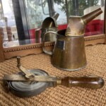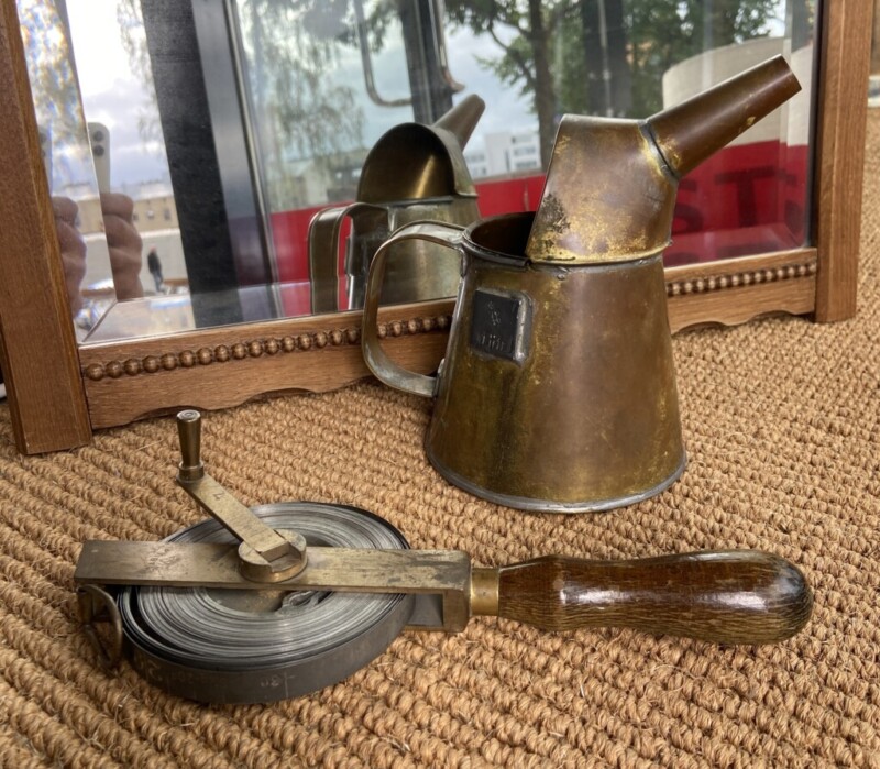 Mittakannu/öljymittakannu messinkiä 1 litra Myyntihinta: 28,00 € Metrimitta messinkiä ja puukahva, Stabila 30 m Myyntihinta: 48,00 €