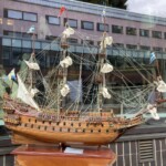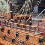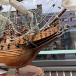 Purjelaivan pienoismalli puuta, noin 1970-luku, hienosti tehty ja kaikki osat paikoillaan ja airot myös tallessa Mitat: myöh.
