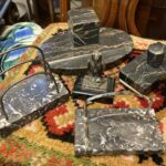 Soittorasiapöytä, upotettu intarsiakuvio Mitat: Myöh. Myyntihinta: MYYTY! Mitat: L.35 S.25 K.38 Pyöreä pöytä, nahkaverhoilu kannessa Mitat: Myöh. Myyntihinta: Myyty! Mitat:... Lue lisää