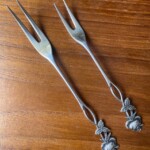 Leikkelehaarukat 2 kpl -pienempi haarukka leimattua 813-kotimaista hopeaa, v.1967 Mitat: P.12 -suurempi haarukka leimattua 813-kotimaista hopeaa, v.1964 Mitat: P.14