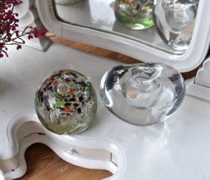 Taidelasi, paperipaino, puhallettua lasia, vasemmalla