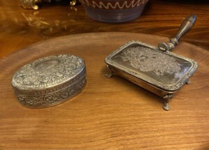 Oikealla, kahvallinen hopeoitu tarjoilu astia Mitat: K.3 15×10 Myyntihinta: 50,00 €