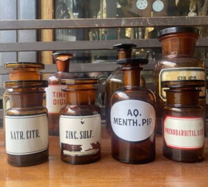 Vanhat lasiset apteekin pullot. Mitat: K.11-21,5