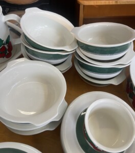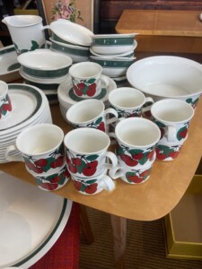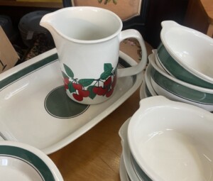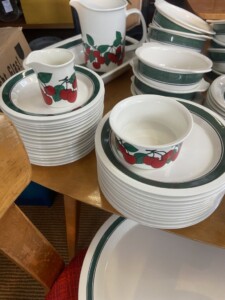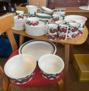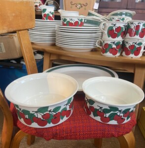 Arabia Kirsikka astiat, kahvikupit, tassit, Pullalautaset, leipälautaset, kermakko ja sokerikko, kulhoja, vadit, puurokulhot.. Erittäin hienossakunnossa!