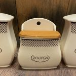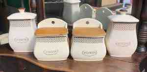 Arabia jauhoja, suolaa salkkarit 2 kpl puukansilla ja 2 kpl posllinikannella sokeria, kahvia