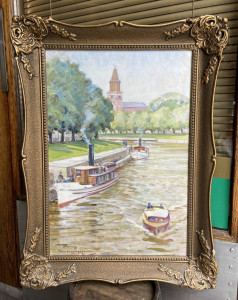 Höyrylaivat joella, vanhaa Turkua, öljyvärimaalaus, sign. Carl Johan Danielsson ”Tipukalle”. Kaunis vanha taulu, harvoin liikkuu tämän taiteilijan maalauksia! Mitat: 70×54