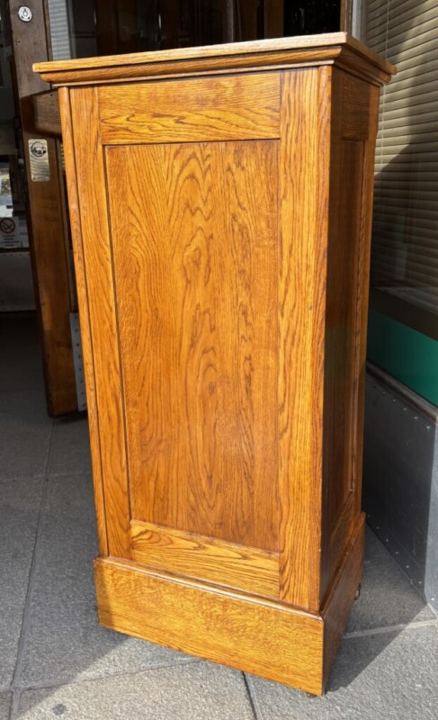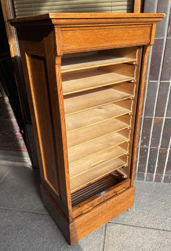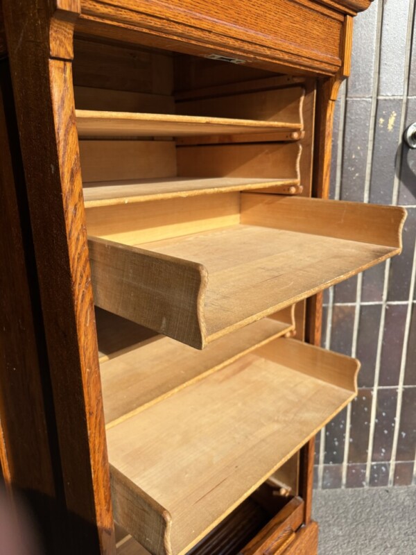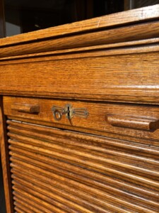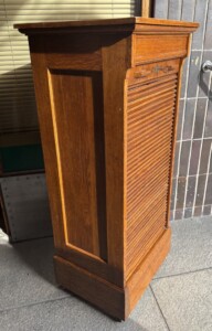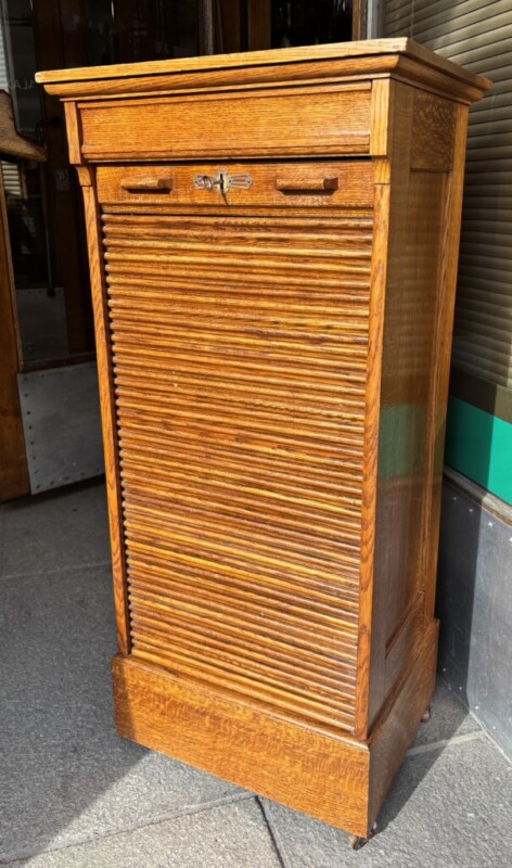 Arkistokaappi rulolla, 1920-luku, avain on ja lukko toimii, vetohyllyt, pienet alkuperäiset renkaat kaapin alla, hienokuntoinen Mitat: myöh.