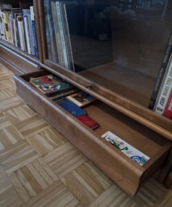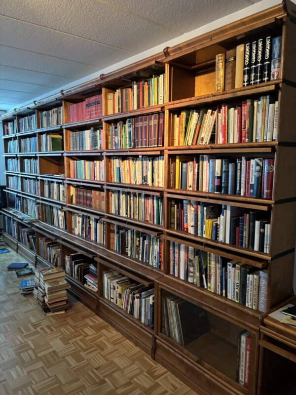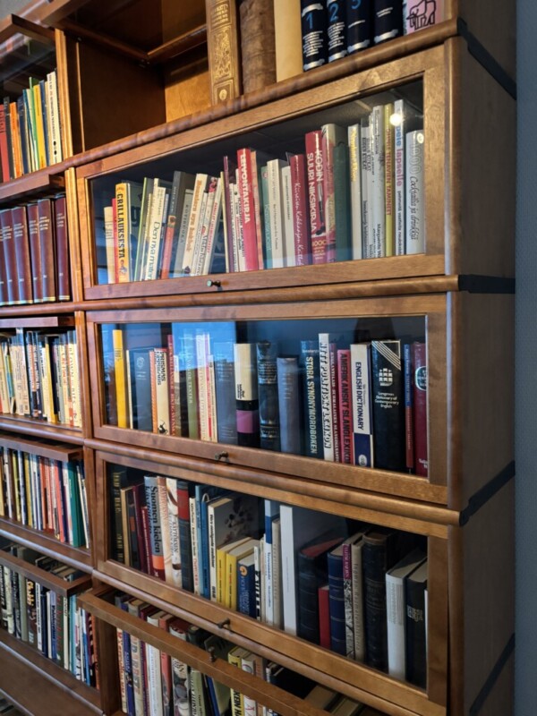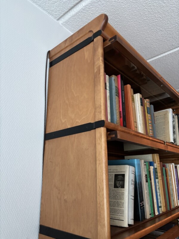 Boknäs kirjahylly 36-osainen, taittolasiovet kaikissa, alhaalla laatikot sokkelissa, hienokuntoinen ja iso kokonaisuus Mitat: Myöh.