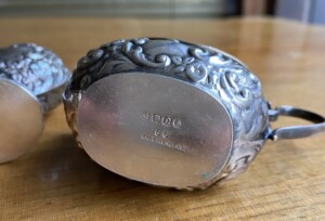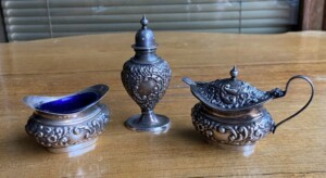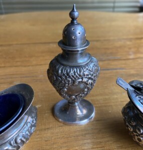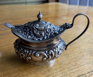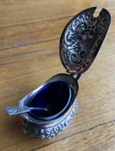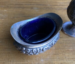 Suolakko, pieni astia vaikka kaviaarille ja pippurisirotin, pieni muslalusikka, sisäosat sinistä lasia, Englantilaista hopeaa Mitat: kysy tarkempia mittoja!