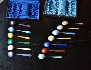 7 kpl, Koruteollisuus Tillander, Helsinki, emaloitu ja kullattu sterlinghopea, kaivertamattomat, oikealla