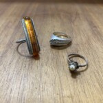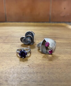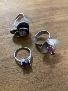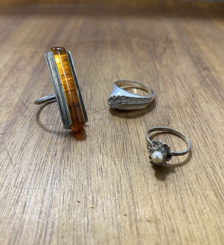 Oikealla Kultasepät Salovaara vintagesormus, kotimaista 830-leimattua hopeaa Mitat: myöh.