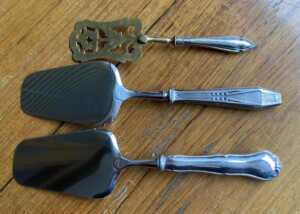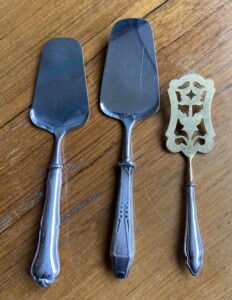 Vasemmalla Chippendale kakkuotin leimattua kotimaista 830-hopeaa Mitat: P22,5 Myyntihinta: 32,00 €