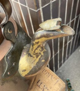 Kuparinen iso kahvipannu ”torakkaläpällä”, yli satavuotias pannu hienossa kunnossa Mitat: Korkeus kahvan kanssa 35cm
