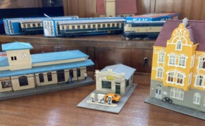 Märklin veturi 3074, vaunut 4112, radan osia, muuntajat, rakennuksia.