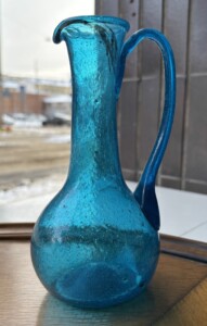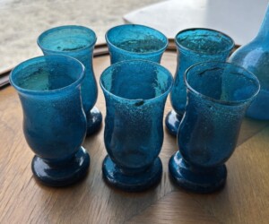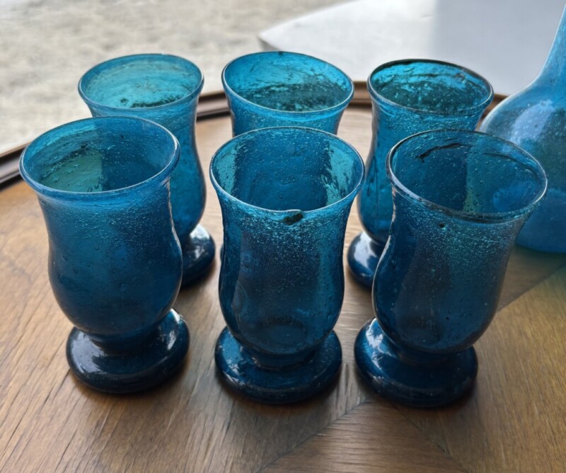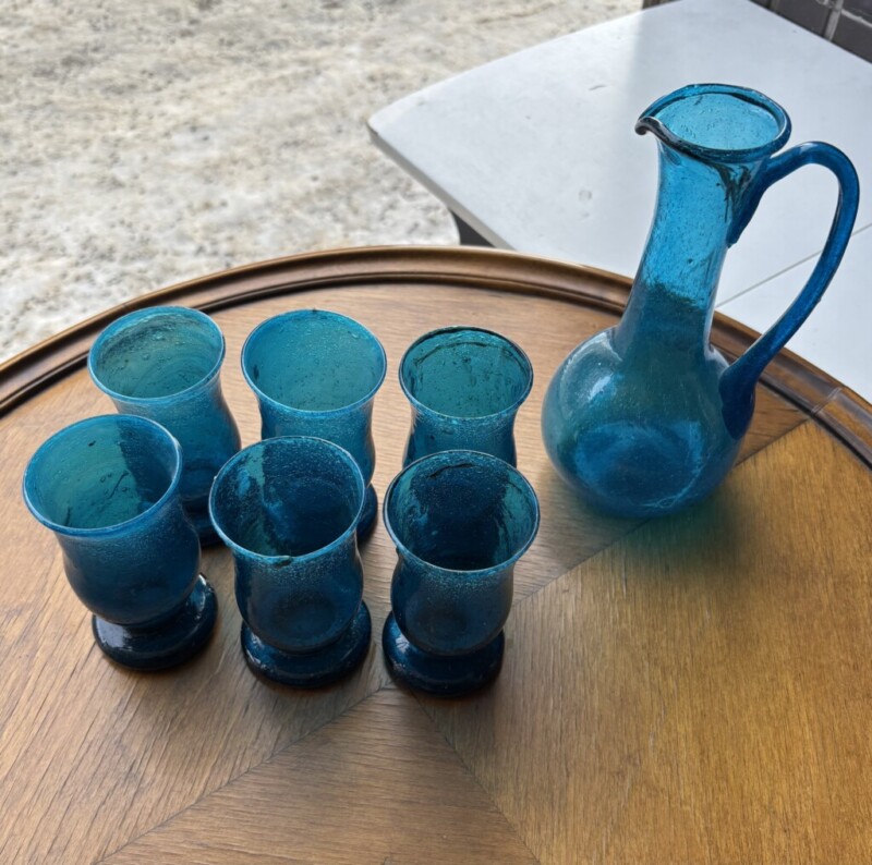 Vanhat juomalasit ja karahvi, puhallettua lasia Mitat: K.10,5 & 19,5.