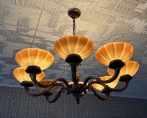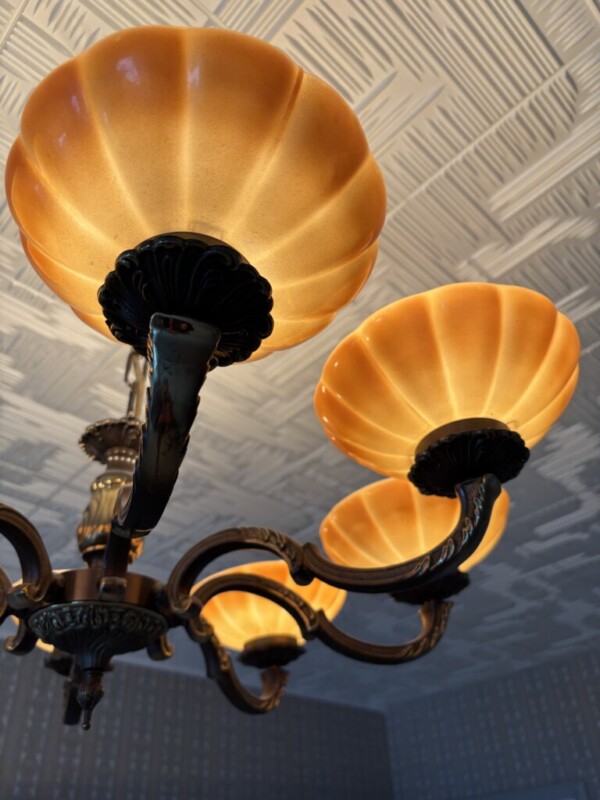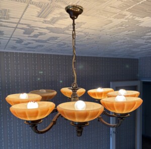Kattolamppu 8-haarainen 1900-luku, messinkirunko, ehjät lassikuupat Mitat: myöh.