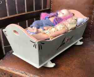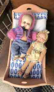 Vanhat 1950-luvun nuket 2 kpl ja, kehto puuta Kakolassa tehty.