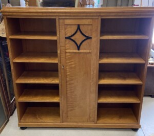 Hylly lukittavalla kaapilla, koivua 1950-luku, säädettävät irtohyllyt, vankkatekoinen! Mitat: L.155 S.38 K.150
