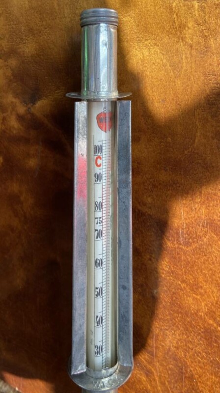 Lämpömittari, ilman lämpö, luettu korkeusero m, korkeuseron korjaus m, alkuperäinen nahkainen suojakotelo Mitat: –