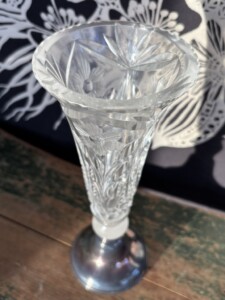 Vaasi kristallia ja kotimaista -leimattua hopeaa, kaiverrus Mitat: myöh.