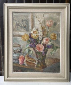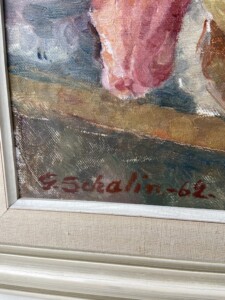 Kukka-asetelma, öljyvärityö kankaalle, sign. G.Schalin -62 Mitat: myöh.