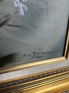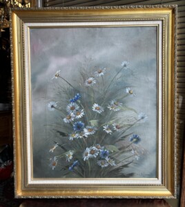 Öljyvärimaalaus kankaalle, kukka-asetelma, sign. P O Junnonen -64 Mitat: 73 x 63