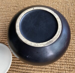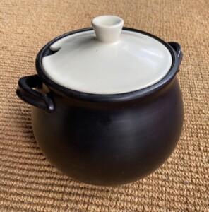 Kupittaan Savi Oy, musta valkoinen kannellin pata, hienokuntoinen ja harvinainen Mitat: K.21 Halk.17