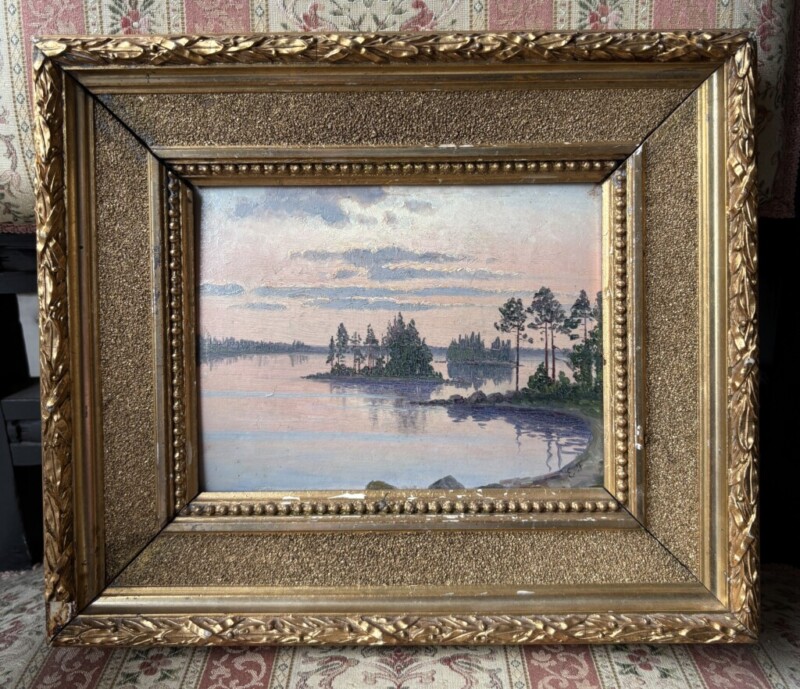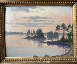 Öljyvärimaalaus, Signeerattu Ellen Favorin, päivätty takapuolelle 18.8. 1899, FAVORIN ELLEN (1853–1919) on tunnettu Suomalainen Kultakauden maisemamaalari. Mitat: 26 x 22