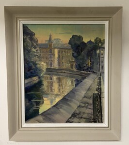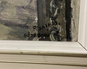 Öljyvärimaalaus, jokinäkymä Göteborg Ruotsi, sign. P.Sainio 1950-luku Mitat: myöh.
