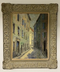 Öljyvärimaalaus, kaupunkikuja/näkymä Euroopasta, sign. K. Ingelius -47 Mitat: 57 x 48