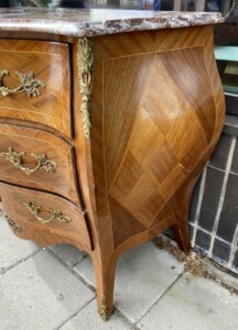 Mahapiironki 1900-luku, mahonkia, messinkilyötteet, vetolaatikot 3kpl, kivikansi Mitat: K.80 L.87 S.49