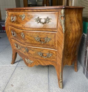 Mahalipasto mahonkia, rokokoo n.1950-luku, intarsiaupotuksia, messinkilyötteet, avaimet