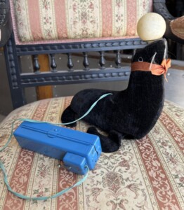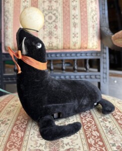 Palloa heittävä peltinen hyljelelu, Japani 1950-luku, harvinainen vanha lasten lelu, patterikäyttöinen, mutta toimivuudesta ei tietoa Mitat: P.18 K.17