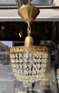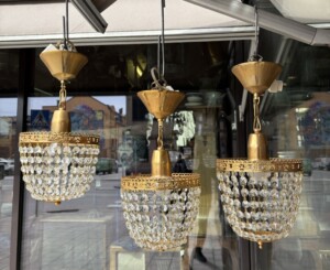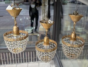 Kristallilamput 3 kpl, kullattu messinkirunko, 1970/1980-luku, pistokkeet Mitat: myöh.