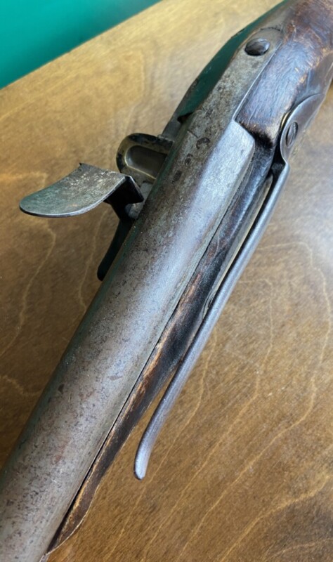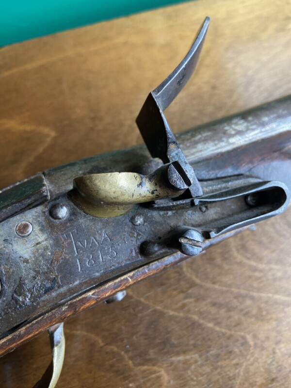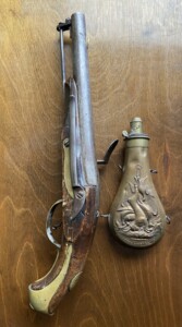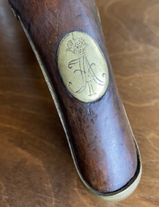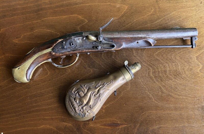 Piilukkopistooli vuodelta 1813, ruutiannostelija kuparia ja messinkiä Sheffield Englanti Mitat: myöh.