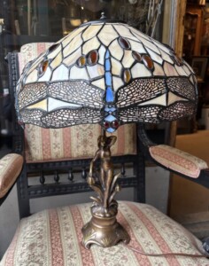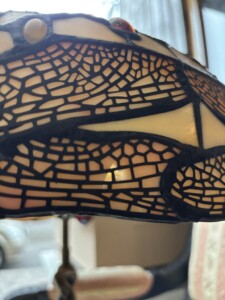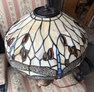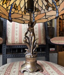 Tiffany pöytävalaisin 1960-luku, raskas aito tiffanylasia, messinkijalka, pieni vika kuvussa Mitat: Myöh.