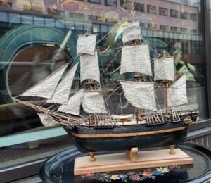 Käsityönä tehty puinen purjelaivan pienoismalli 1900-luku Mitat: K.67 Pit.72