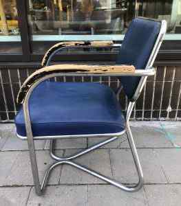 Funkkis käsinojatuoli n.1950-luku, niklattu metallirunko, alkuperäiskuntoinen nahkaverhoilu Mitat: L.56 Selkänojan K.83