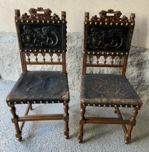 Tuolit 2 kpl tammea 1800-luku, nahkaverhoilu, lohikäärme koristelu Mitat: myöh.