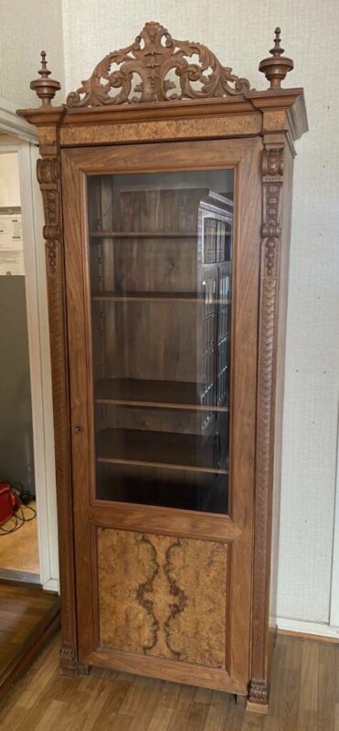 Vitriinikaappi 1800-luku renesanssi-tyyli, mahonkia, lukko ja ja avain toimii, sisällä säädettävävät hyllyt 5 kpl, irralliset yläkoristeet Mitat: K.205 L.87 S.51
