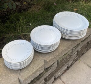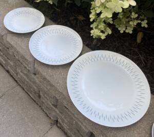 Arabia, Friedl Holzer-Kjellberg riisiposliini lautasia, kolmea eri kokoa. Mitat: Halk.15,5 – 25,5cm