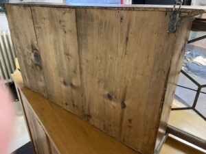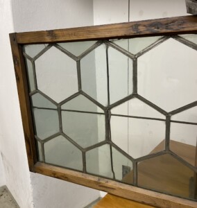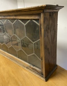 Seinävitriinikaappi 1800/1900-luku, liukulasiovi, lyijylasityö, erikoinen malli, seinäkiinnikkeet Mitat: myöh.