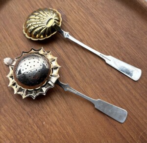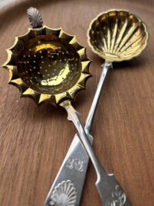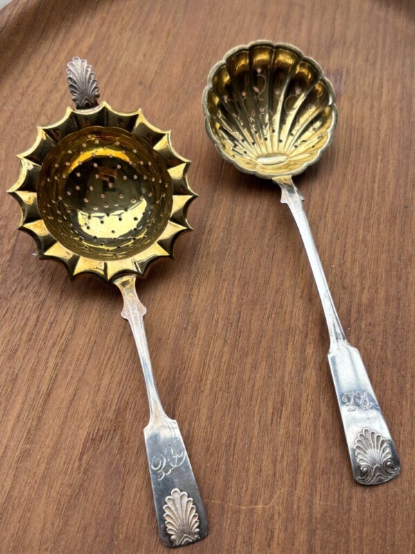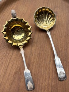 Musla sirotinlusikka vasemmalla Auran Kultaseppä Oy, kotimaista 813-leimattua hopeaa, v.1949, harvinainen malli, kaiverrus Mitat: P.15,5