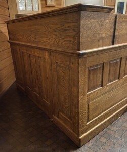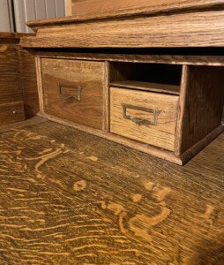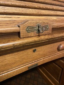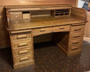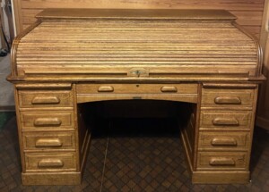 Rulokirjoituspöytä, 1900-luvun alkupuoli, tammea, erittäin hienokuntoinen työpöytä, avain tallessa ja lukko toimii, valmistaja SYSTEMA TURKU-ÅBO, pöydän saa purettua 3-osaan kuljetuksen ajaksi Mitat: myöh.