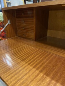 Tiikkinen kapea kirjoituslipasto, 1960-luku, klaffin sisällä laatikoita, alhaalla liukuovet 3 kpl, molemmin puolin laatikoita, keskellä hyllyt. Erittäin kompakti ja käytännöllinen kaappi/lipasto. Ehjä ja hienokuntoinen! Mitat: L.115 S.38 K.97