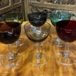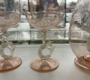 Lasikarahvi ja pikarit 5 kpl, Muranonlasi n.1930/1950-luku, upeat lasinpuhaltajan tekemät lasiveistokset jaloissa ja karahvin sisällä! Mitat: Karahvi K.24 Pikari K.8,5