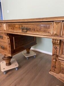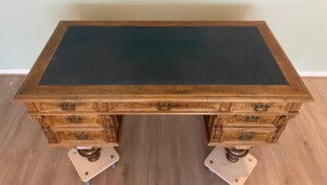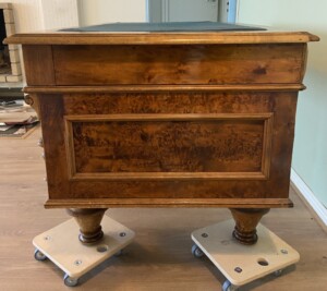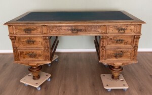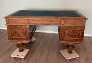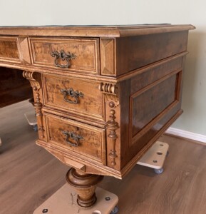 Kirjoituspöytä visakoivua 1800-luku, uusrenesanssityyli, vihreä verkakansi, hienokuntoinen työpöytä Mitat: myöh.