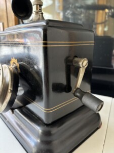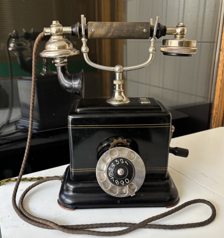 Pöytäpuhelin L.M. Ericsson, metallia, pakeliitti räkätorvi